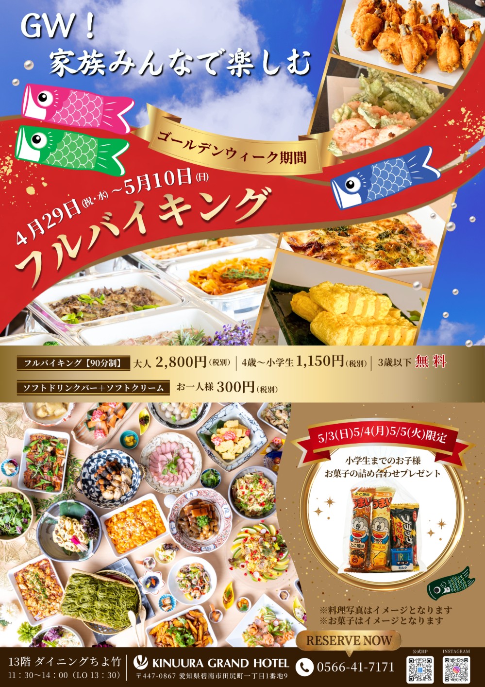 衣浦グランドホテル13階の「ダイニングちよ竹」では、ゴールデンウィーク期間中、ご家族皆様で楽しめる特別バイキングを開催いたします。